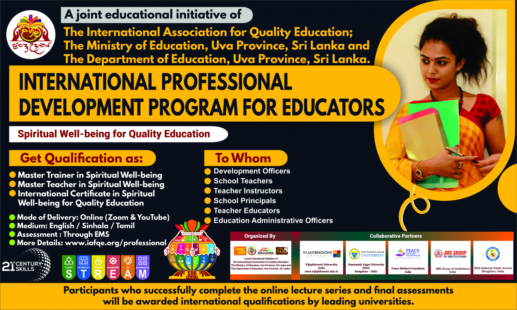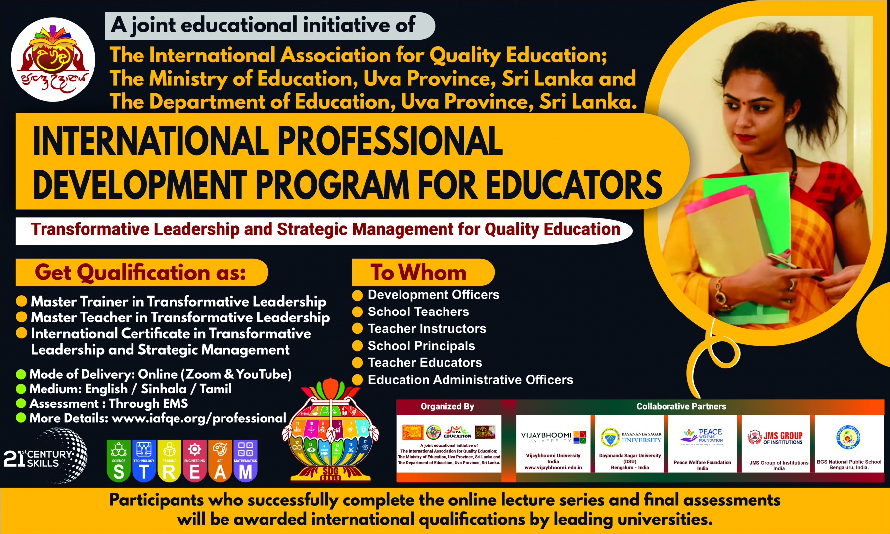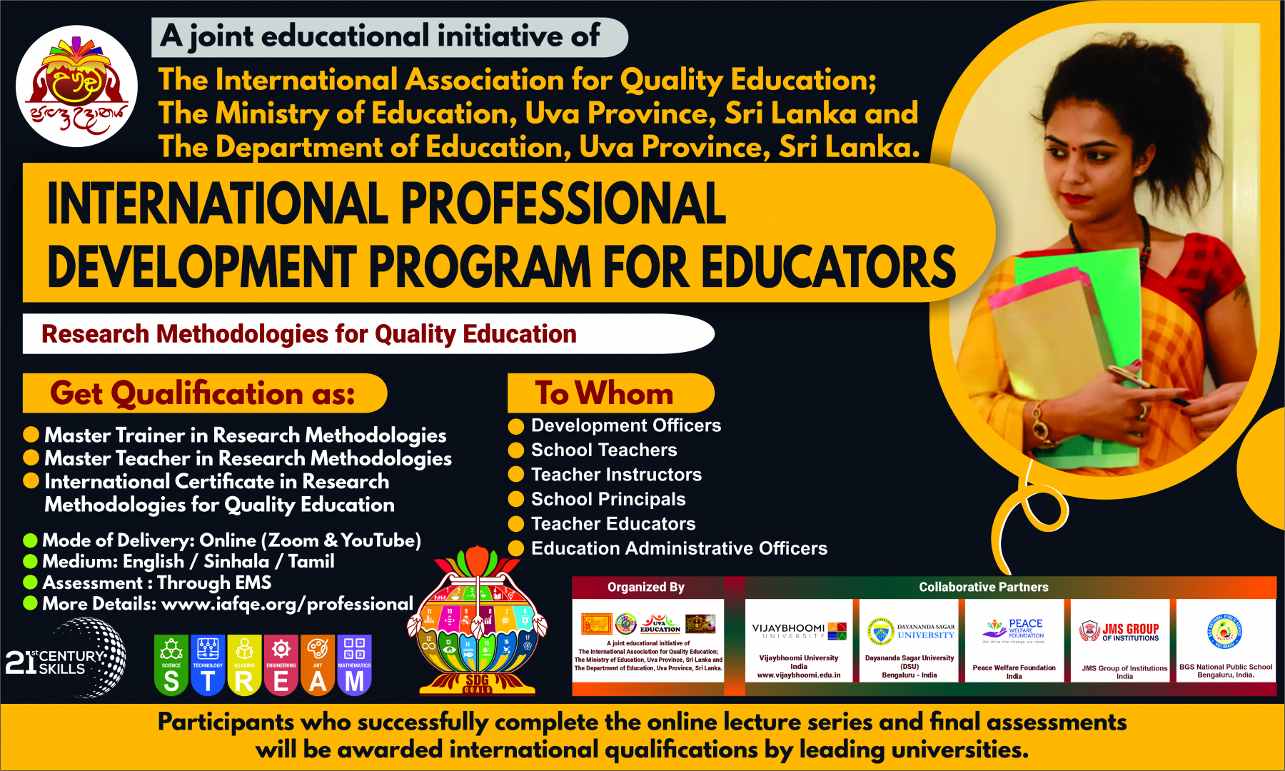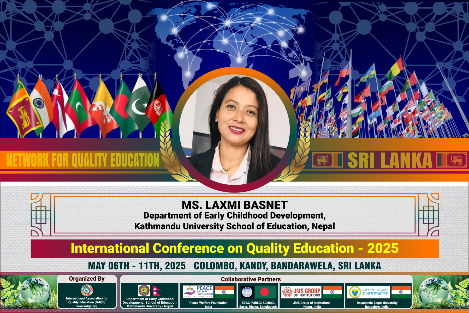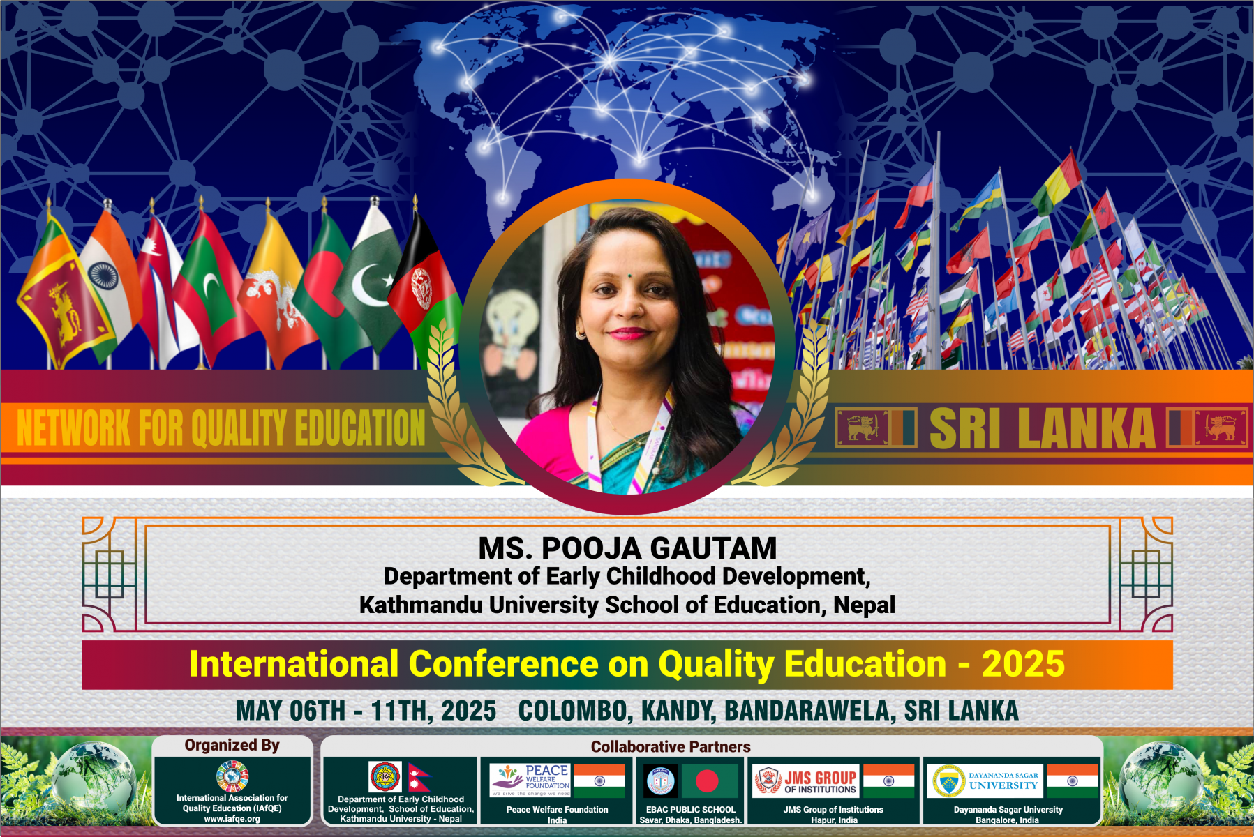 The conference is organized by the International Association for Quality Education (IAFQE) in collaborative partnership with the Ministry of Education, Uva Province, Sri Lanka; Dayananda Sagar University, Bengaluru, India; Vijaybhoomi University, Mumbai, India; the Pease Welfare Foundation; C4Cynergy, Mumbai, India; and Shikshalaya, Nepal.