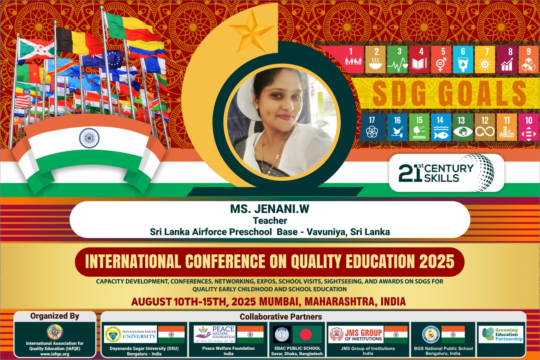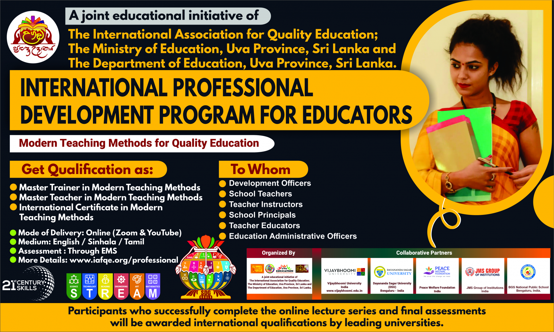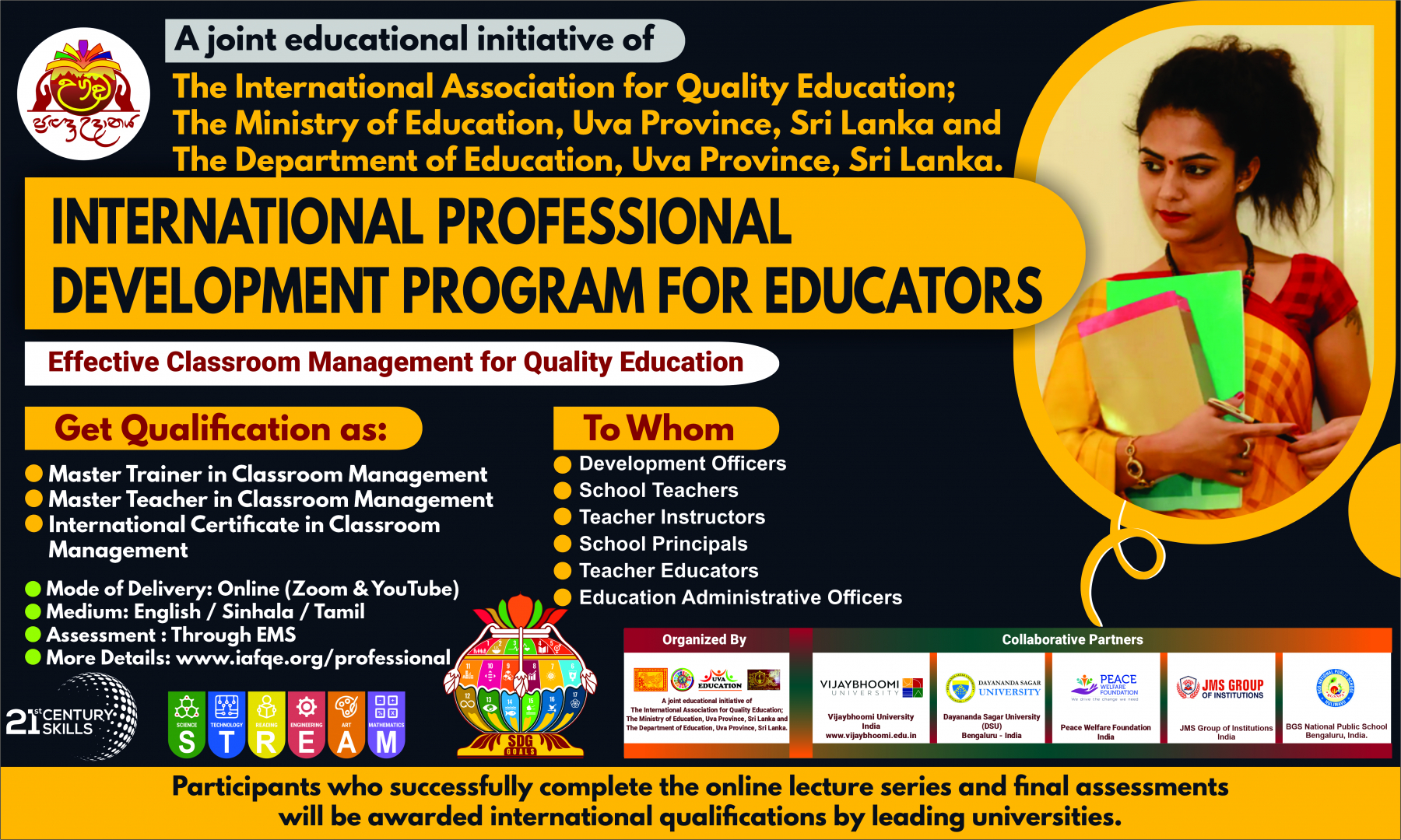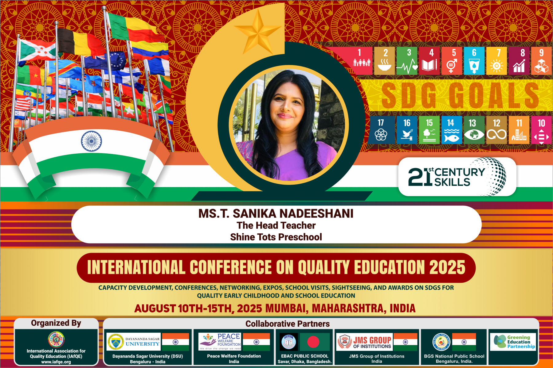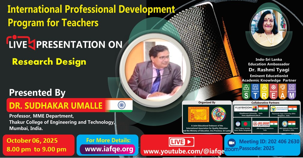 The conference is organized by the International Association for Quality Education (IAFQE) in collaborative partnership with the Ministry of Education, Uva Province, Sri Lanka; Dayananda Sagar University, Bengaluru, India; Vijaybhoomi University, Mumbai, India; the Pease Welfare Foundation; C4Cynergy, Mumbai, India; and Shikshalaya, Nepal.