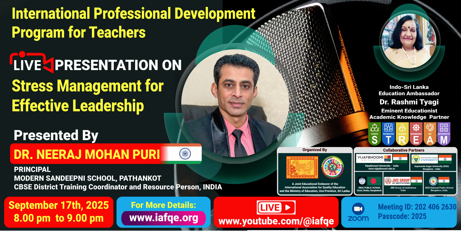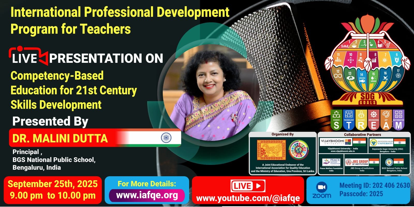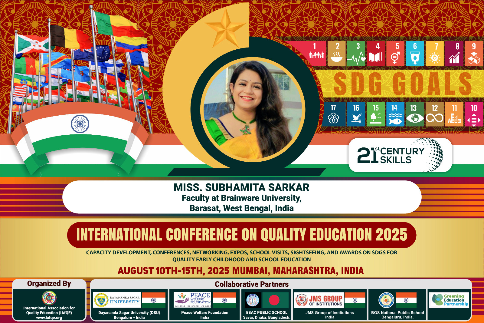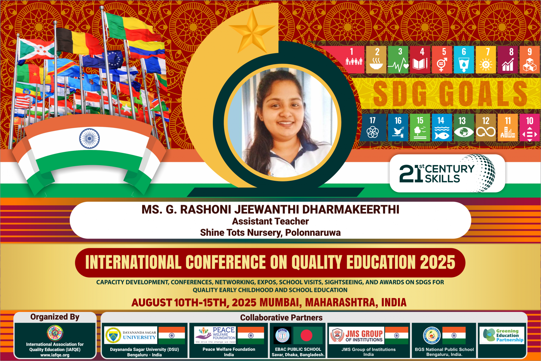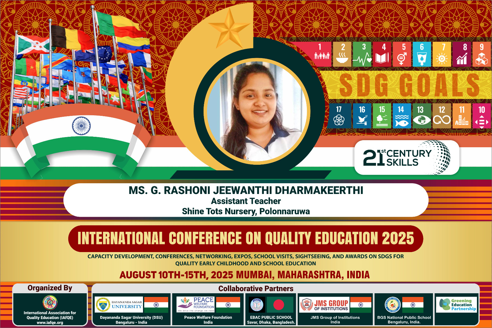 The conference is organized by the International Association for Quality Education (IAFQE) in collaborative partnership with the Ministry of Education, Uva Province, Sri Lanka; Dayananda Sagar University, Bengaluru, India; Vijaybhoomi University, Mumbai, India; the Pease Welfare Foundation; C4Cynergy, Mumbai, India; and Shikshalaya, Nepal.