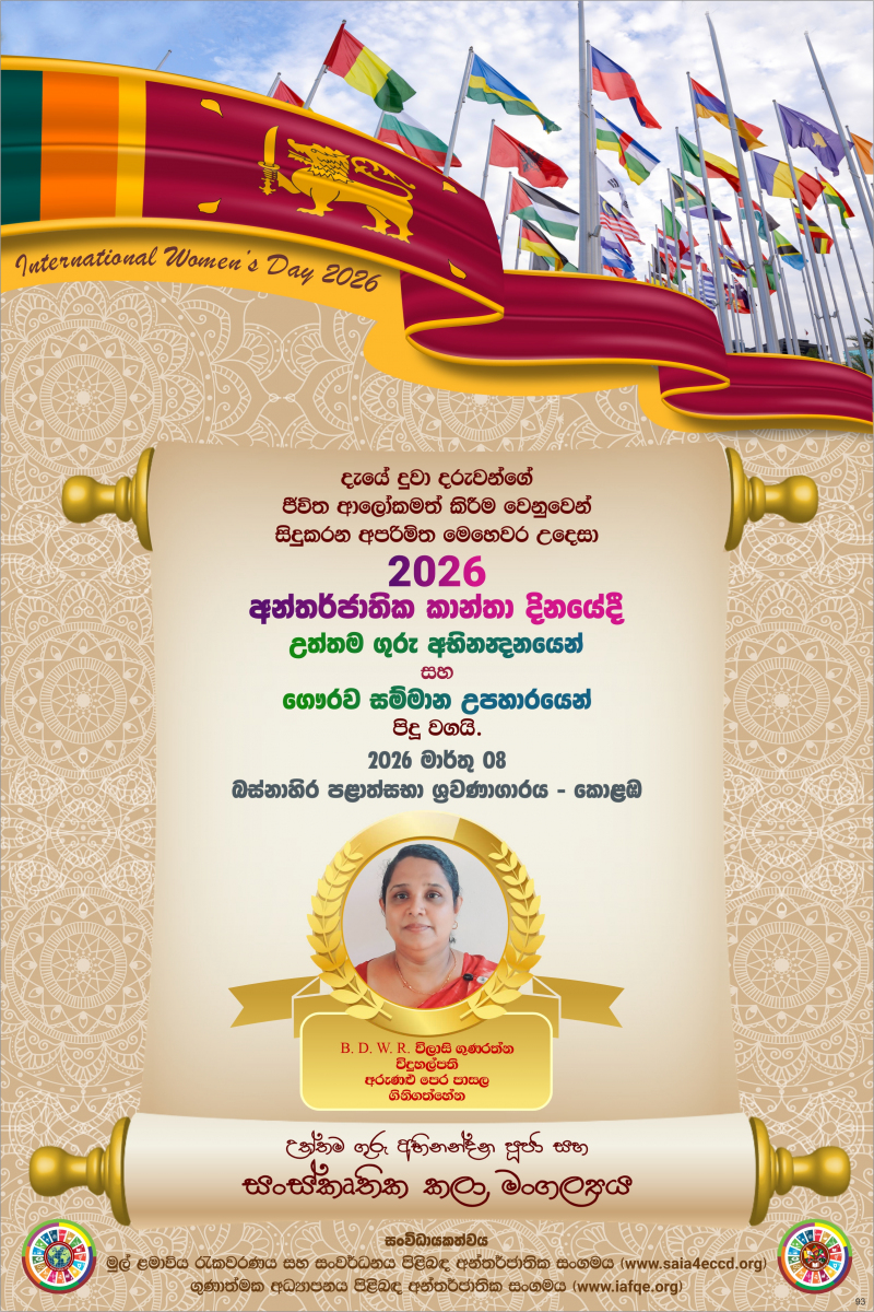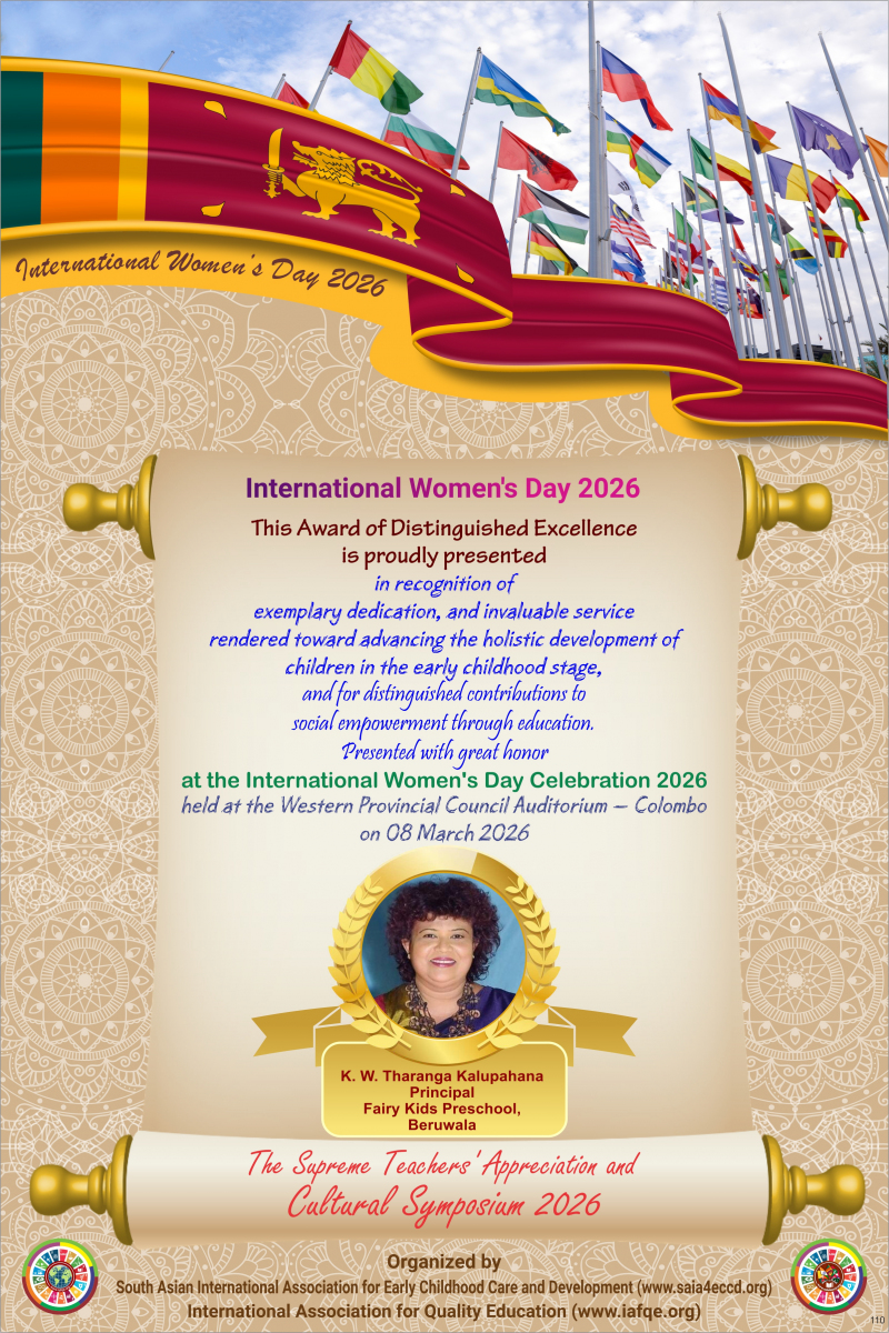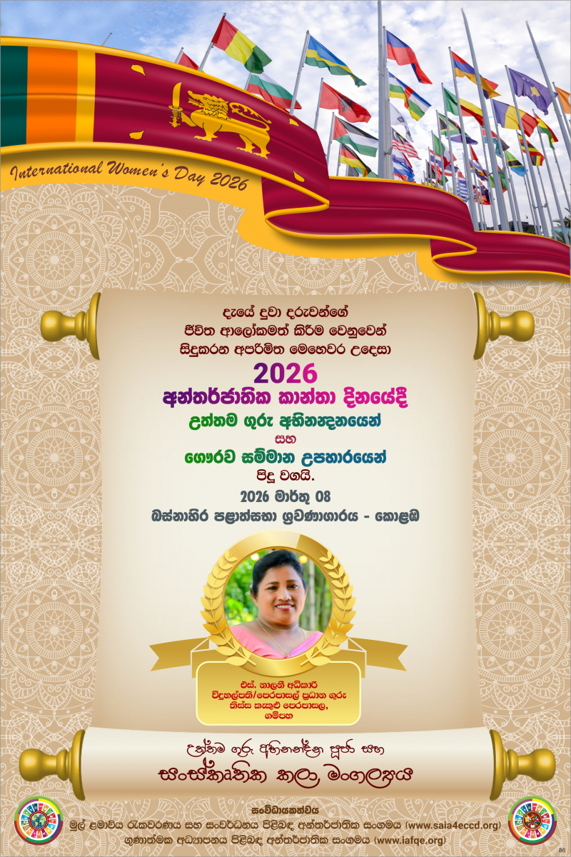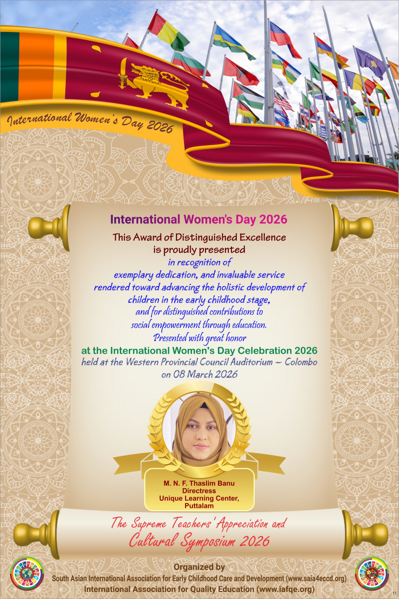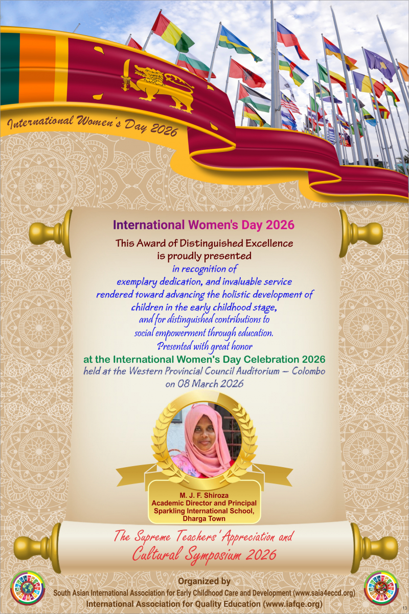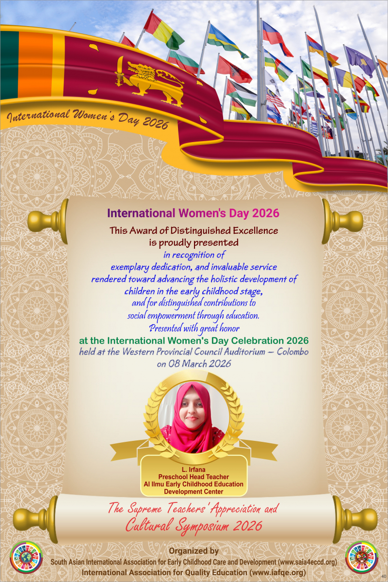 The International Women’s Day 2026 theme, “Give to Gain,” emphasized the importance of recognizing and valuing women’s contributions in order to empower families, societies, and the world at large. The celebration was held in Colombo, Sri Lanka, where women from the global community who contributed to improving the quality of education with IAFQE were appreciated and honored. Sri Lankan educators were also honored for their dedication to enhancing the quality of education.