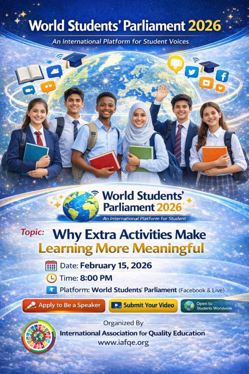 Discussions from The World Students’ Parliament will be shared on the official websites and social media platforms of IAFQE and SAIA4ECCD. Participants will receive certificates, and outstanding speakers will have the opportunity to deliver special speeches at international conferences and other global events. Moreover, they stand a chance to receive awards, medals, and honors for their exceptional performance.”