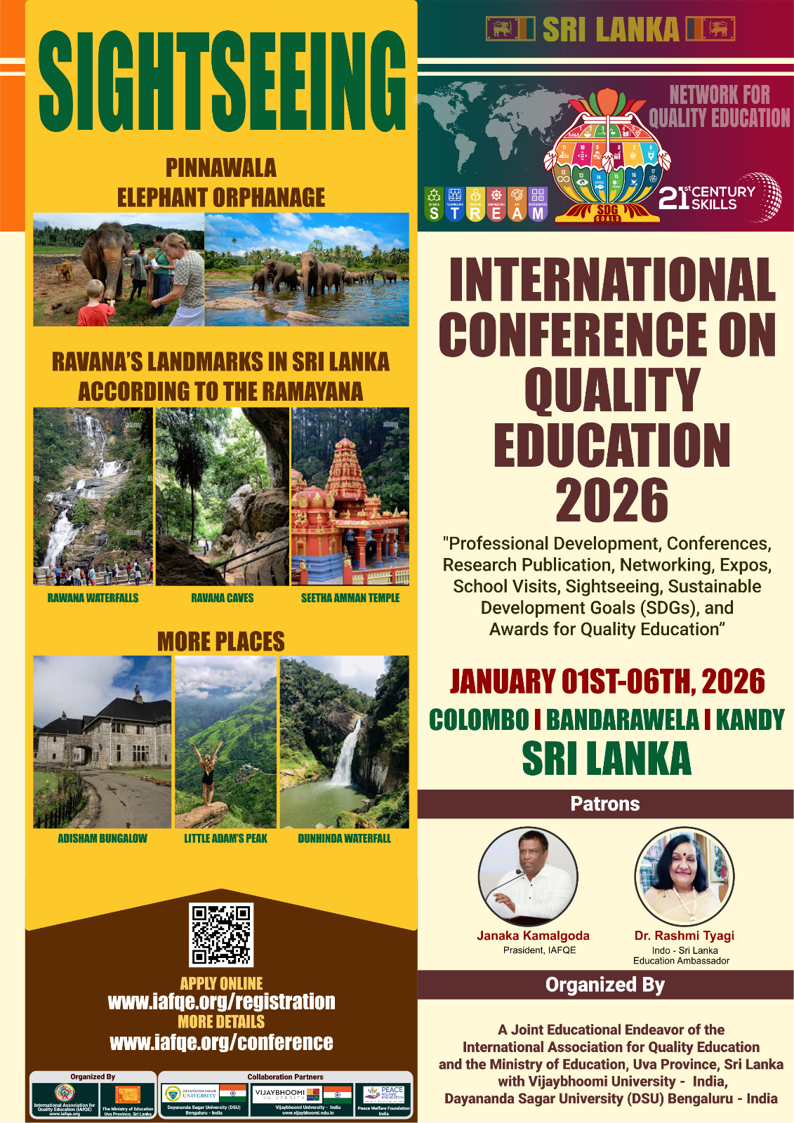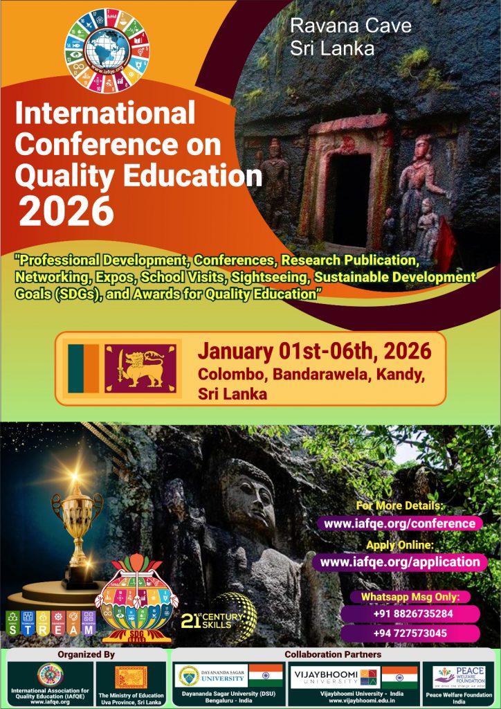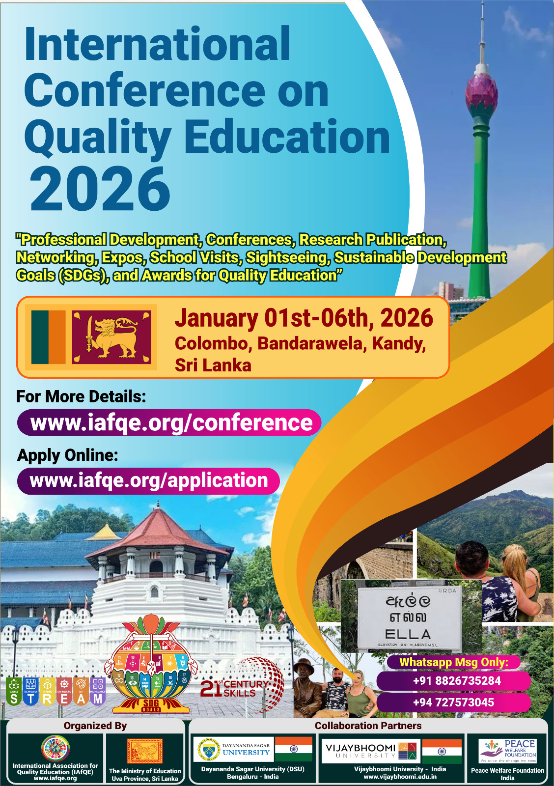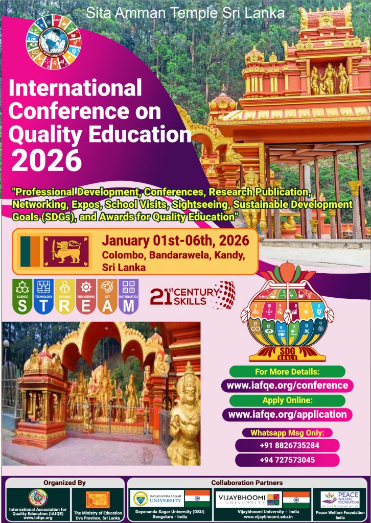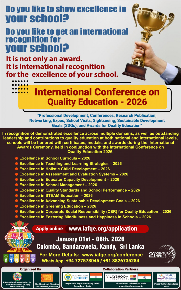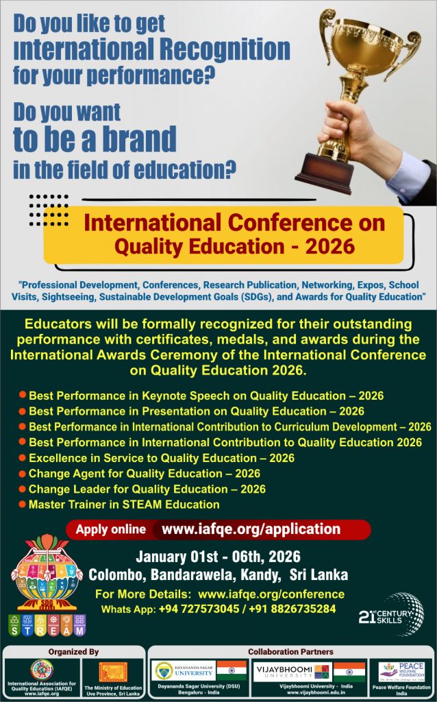 Outstanding educators will be recognized at the International Conference on Quality Education 2026, held in Colombo, Sri Lanka from January 1–6, 2026.