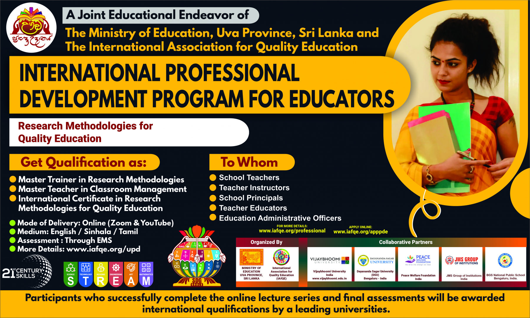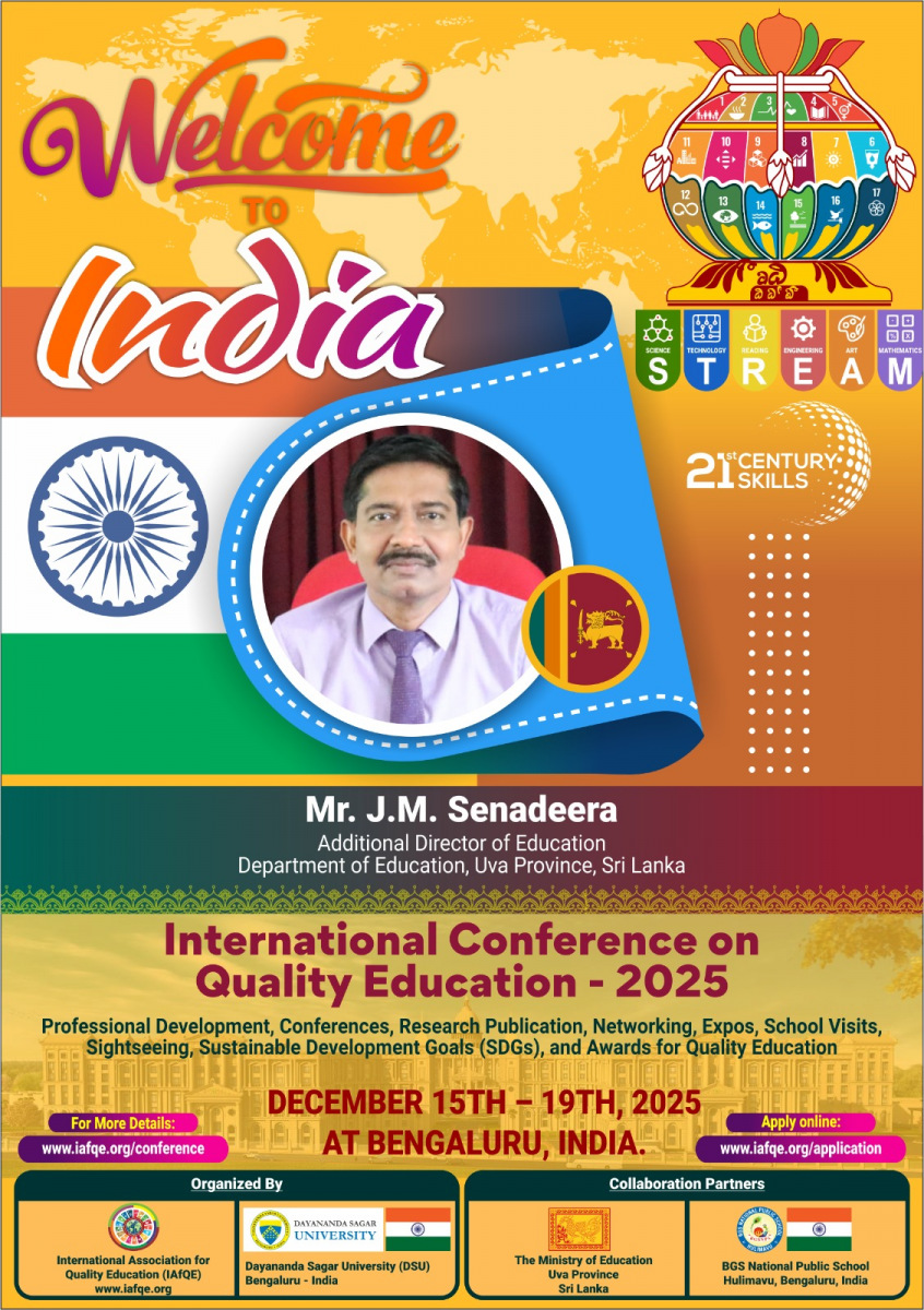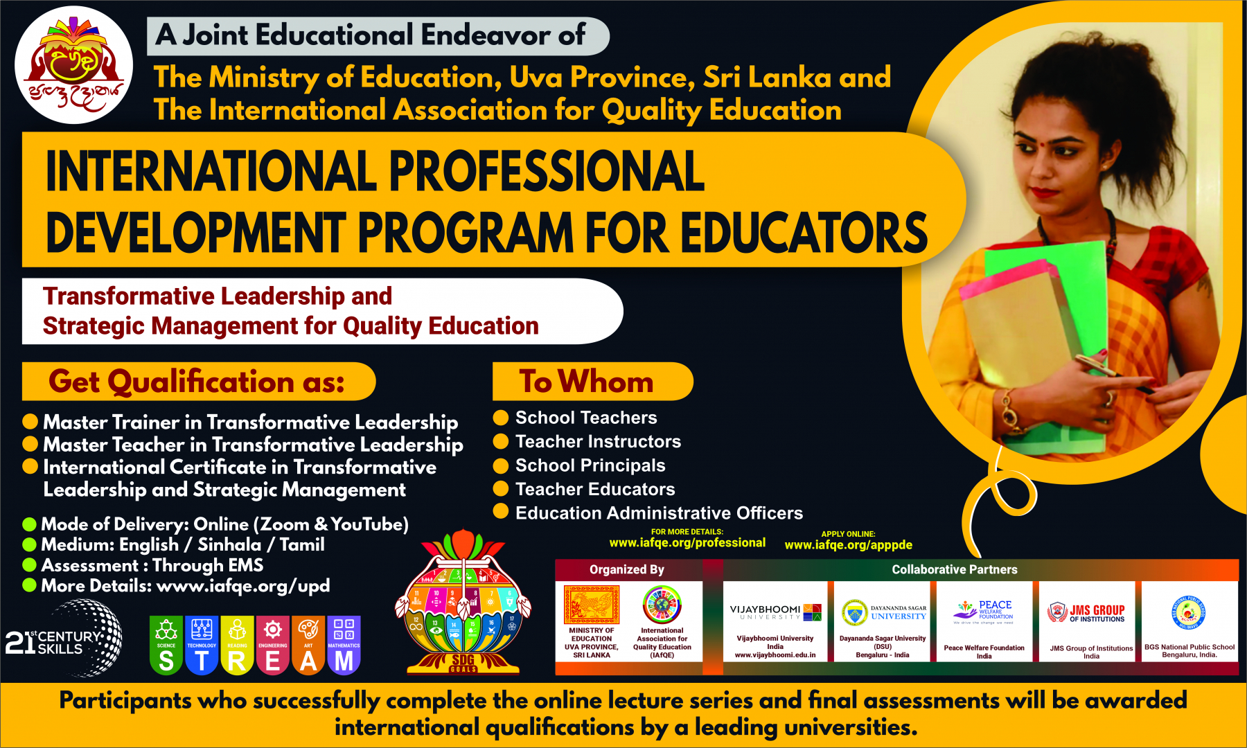 In today’s interconnected world, international collaboration is no longer a choice, but a necessity. The partnership between the Uva Provincial Education Department, the International Association for Quality Education (IAQE), and global universities reflects our commitment to building bridges of learning across nations. This collaboration brings global expertise, modern pedagogies, and technology-enabled practices into our classrooms — empowering both teachers and students to think critically, create boldly, and act compassionately.