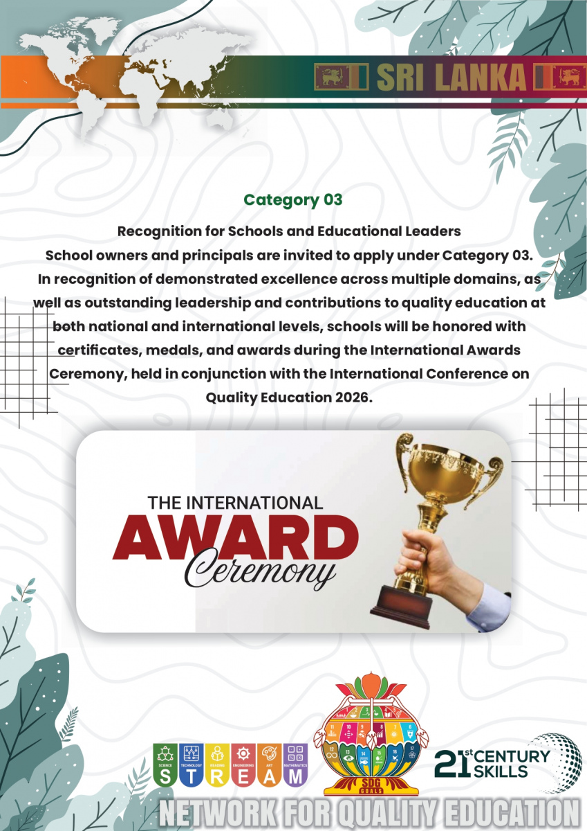 We are pleased to announce that the International Awarding Ceremony 2025 will be held on October 27th, 2025, from 9:30 AM to 2:00 PM, at the Main Auditorium, Western Province Provincial Council, No. 204, Denzil Kobbekaduwa Mawatha, Battaramulla, Colombo.