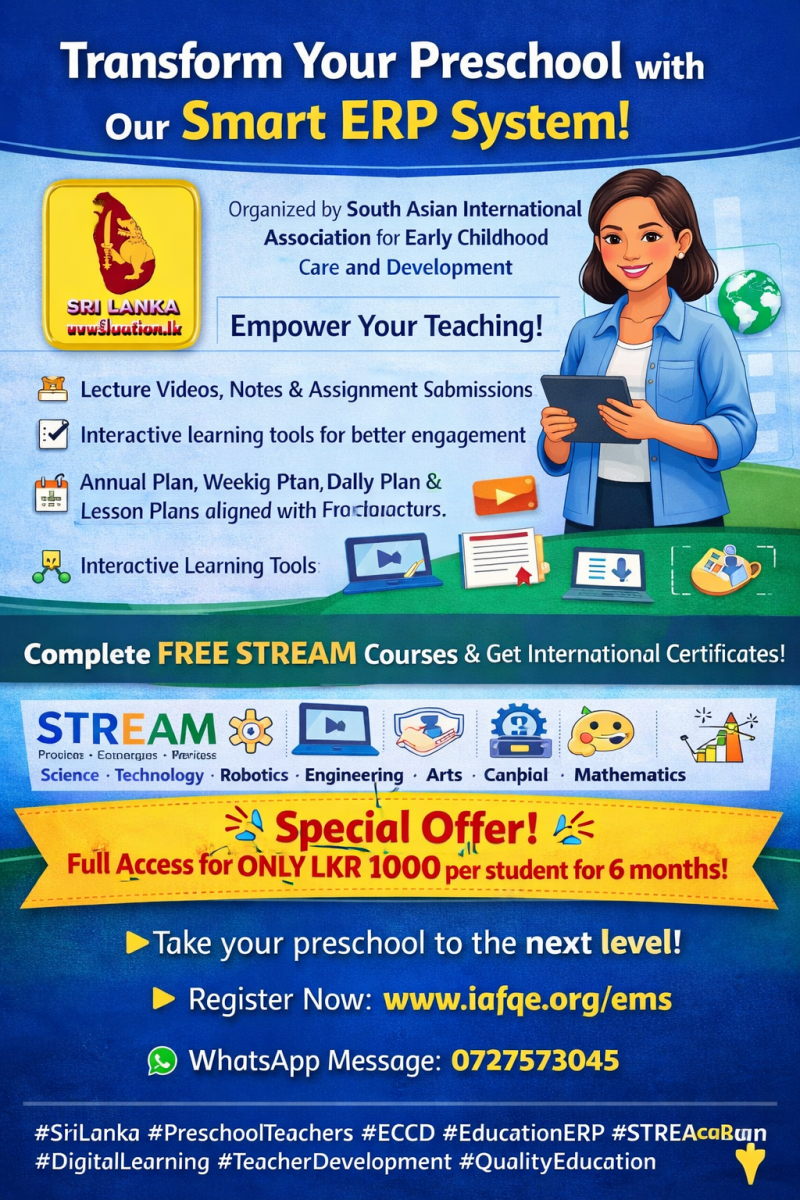 In today’s rapidly changing world, technological transformation in education is not only timely but essential. As we collectively strive to achieve Sustainable Development Goal 4 (Quality Education), IAFQE has introduced a cutting-edge Education Management System (EMS) that supports schools, higher education institutions, training institutes, and pre-primary centers. Sri Lanka Education Mobile app was introduced to Sri Lankan universities, institutes and schools as well as pre school sector as an Education Management System (EMS).