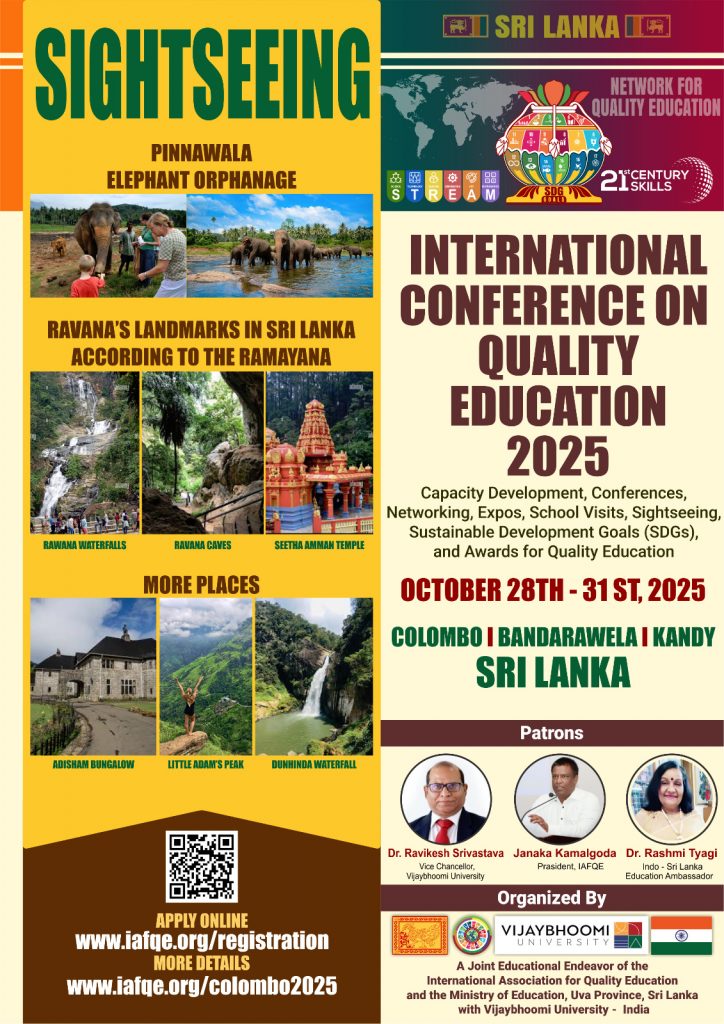 The next edition will be held in Colombo, Sri Lanka, in collaboration with the Ministry of Education – Uva Province, Sri Lanka, and Vijaybhoomi University, Mumbai, India, and organized by the International Association for Quality Education.